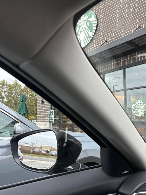 This person who is parked in front of one Starbucks and...can literally see another in their rearview mirror: