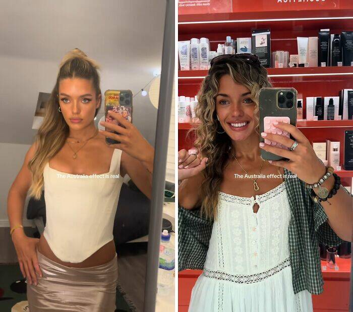 Saw this on several sites, and no matter how many or few words, it is just people taking fancy and less fancy pics. Theres no evidence these are before or after or how long between. It could be the next morning or right after a shower.