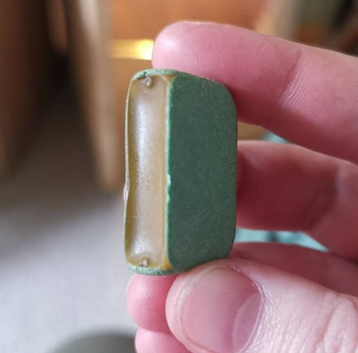 “Found on the beach, it’s solid, and the green casing feels like stone, but is almost a little stretchy when I try to pull at the edges.”