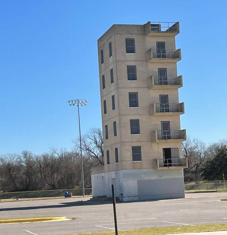 “What is this 6-floor tiny tower in the middle of a parking lot, adjacent to a baseball field?”