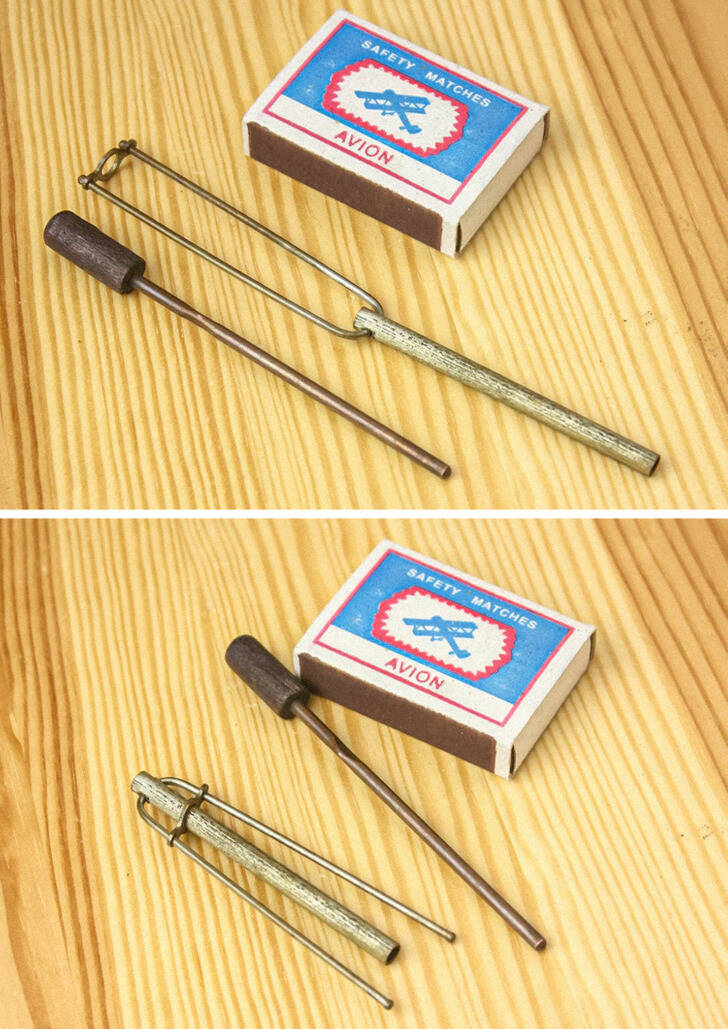 “I found this in the garage, a tube with notches made of brass, the rest of the cover on top. It has a copper rod with a wooden handle.”
